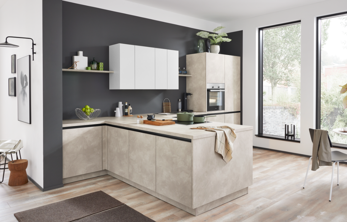 In Worms, Trier, Ludwigshafen und Umgebung sucht man Küchen, die praktisch sind und trotzdem Stil ausstrahlen. Diese moderne Küche überzeugt mit ihrer Weiß-Beton-Optik, die Loft-Charme in jeden Raum bringt. Die schwarzen Griffleisten setzen moderne Akzente, während die T-förmige Anordnung (ca. 420 x 250 cm) für effiziente Arbeitsabläufe sorgt.