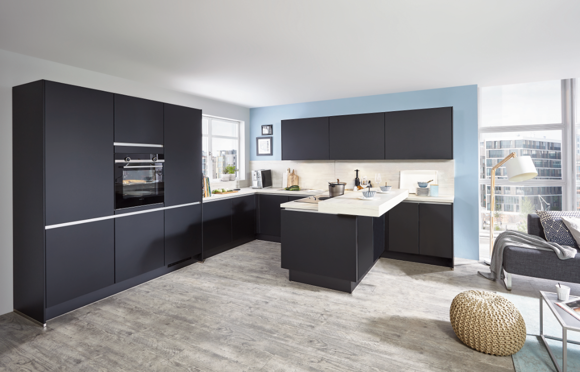 In Frankenthal, Alzey und Bitburg sucht man Küchen, die Design und Praktikabilität perfekt vereinen. Diese U-Form-Küche besticht durch ebony-anthrazitfarbene Fronten, die Tiefe und Eleganz ausstrahlen, und edelstahlfarbene Griffleisten, die für einen modernen Look sorgen. Die aufgesetzte 10 cm starke Pultplatte bietet zusätzlichen Arbeits- und Essbereich – ideal für Familien und Hobbyköche.