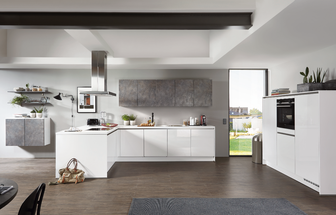 - Hochwertige Oberflächen, Front Lack Ultrahochglanz alpinweiß, Hängeschränke, Highboard und Regalböden im aktuellen Farbton Rusty Plates, Korpus und Arbeitsplatten weiß