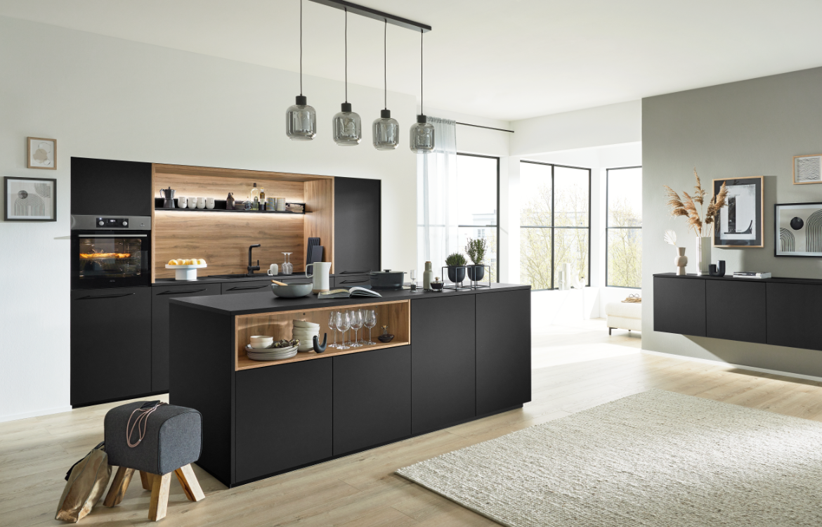 - Front schwarz softmatt, Nischenverkleidung und Regalelement Sierra Eiche Nachbildung, Arbeitsplatten im Farbton Schwarz Pro