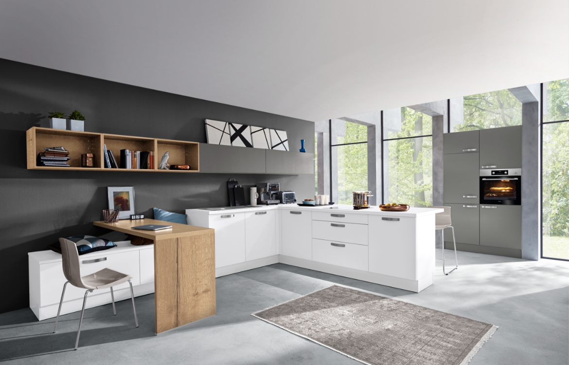 - Hochwertige Oberflächen, Front in Weiß, Hochschränke und Hängeschränke in Achatgrau, Regale und Tischelement in Alteiche Wildoak-Nachbildung, Arbeitsplatte in Weiß